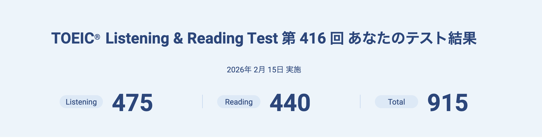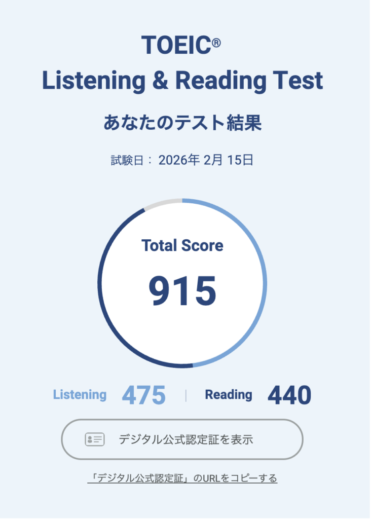 結果スコアは Listening 475 / Reading 440 / Total 915でした。最低850を目指したいと思っていて、900超えたら嬉しいな〜くらいの目標だったので運よく自分の合格ラインを超えられました。