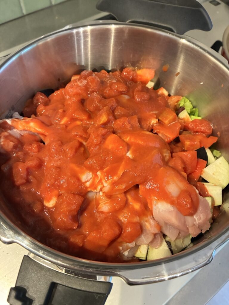鍋の一番底に、一番水分の出やすい新玉ねぎをセット、その後はセロリ・茄子・トマトなど他の野菜を乗せ、その上に鶏肉を入れる。最後に全体を覆うようにトマト缶を入れ、調味料を入れる。